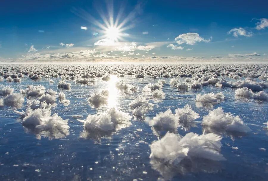 科学家表示,当气温下降到零下22摄氏度时,在平静的海面上,如果干燥的空气比海水更冷,就会出现罕见的“冰莲花”奇观。